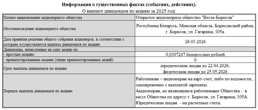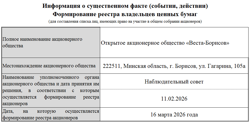 «26» марта 2026 года в 10.00 часов по адресу: Минская область, г. Борисов, ул. Гагарина, 105а, универмаг «Веста», 1 этаж (актовый зал) состоялось годовое общее собрание акционеров: