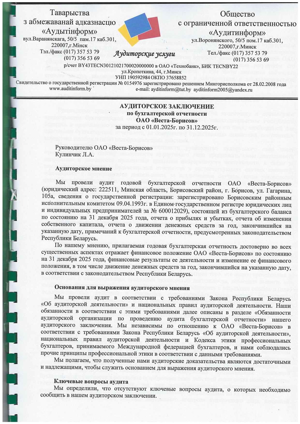 4. О результатах аудиторской проверки и проверки ревизионной комиссии финансово-экономической деятельности Общества за 2025 год.
